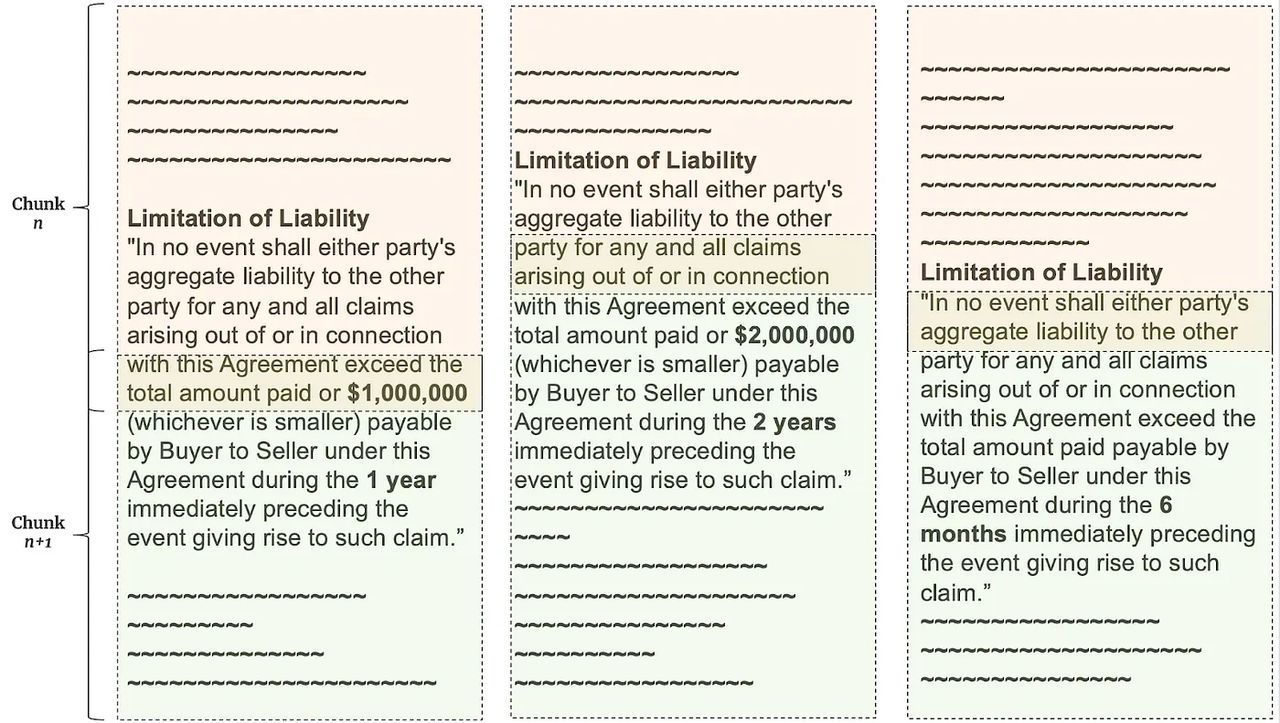 In the example below, we have three purchasing contracts, for three different clients, but the wording is identical except for the amounts and duration of this specific liability clause. If only a basic character-based chunking with overlap is done, the resulting chunks could become as shown in orange and green. Without any indication of which Buyer and which Seller each chunk is discussing, it’s virtually impossible for the LLM to generate an accurate answer if fed the 6 chunks shown (which might all match a question about “limited liability terms for partner ABC”).