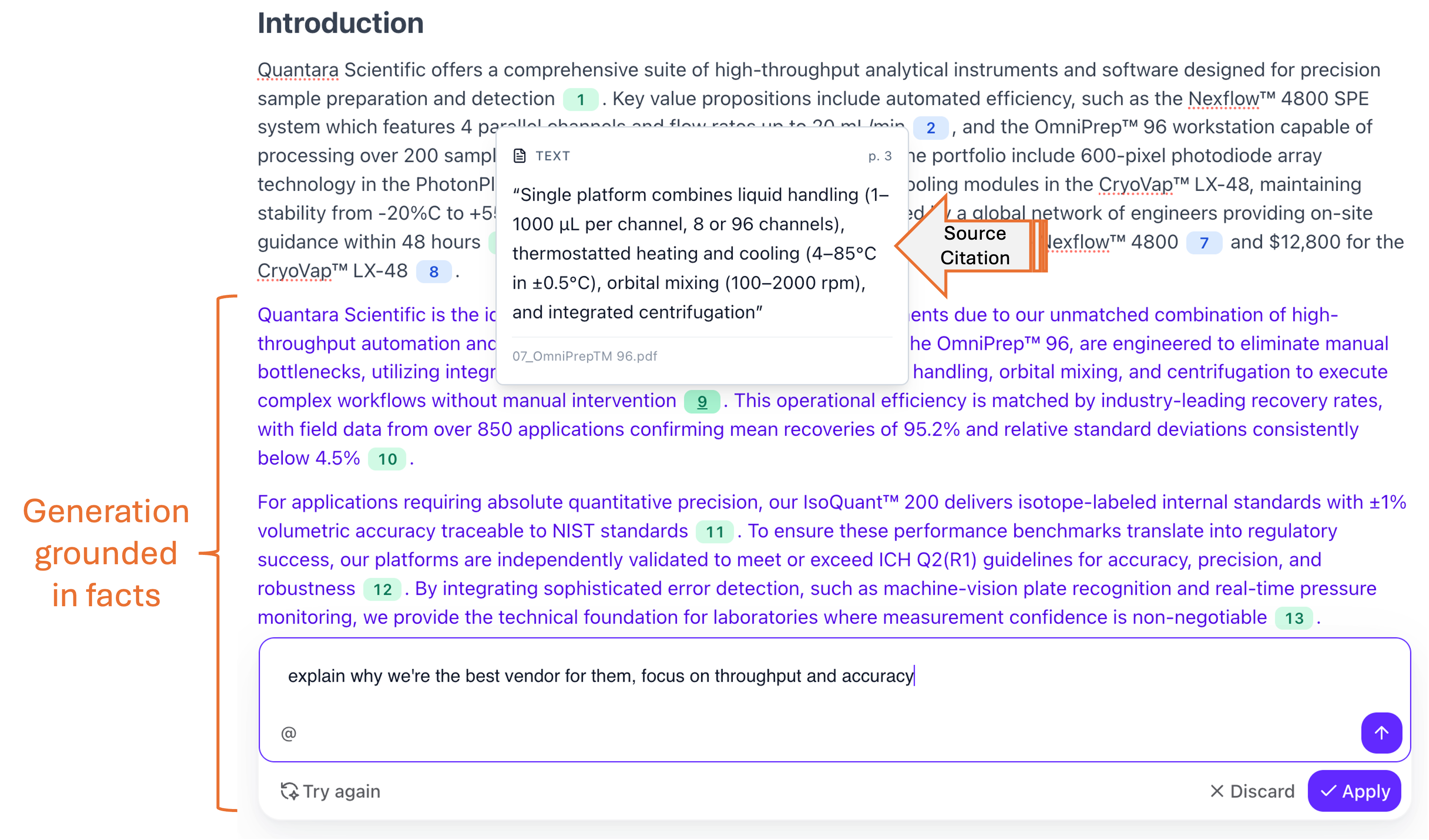 Grounded content generation solves this at the architecture level. Every sentence in the output can be traced back to a specific document, passage, or data point in the enterprise knowledge base. The writing is not produced first and checked afterwards; it is produced from the sources, with citations attached.